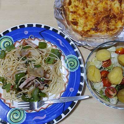 【8月27日の晩ごはん】献立・スパゲティー(厚切りベーコン、ピーマン、玉葱)味(塩、コショー、醤油、顆粒コンソメ)・ピザ(市販品)・サラダ(···