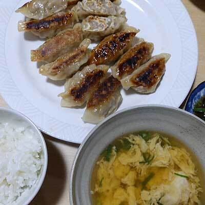 【7月29日の晩ごはん】献立・手作り餃子(豚ミンチ、茹でキャベツ、ニンニク、生姜)・かきたま汁(九条葱、卵)☆餃子の皮は市販品を使います、具···